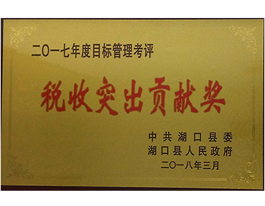 The CPC Hukou County Party Committee and the People's Government of Hukou County jointly awarded the honor of "2017 Outstanding Contribution Award for Target Management Evaluation and Tax Revenue".