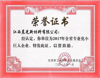 Jiangxi Provincial Industry and Information Technology Commission awarded the honor of "2017 Jiangxi Provincial Professional Small Giant Enterprise".