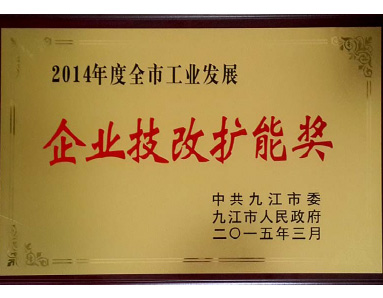 Jiujiang Municipal Committee of the Communist Party of China and Jiujiang Municipal People's Government jointly awarded the "2014 Municipal Industrial Development Enterprise Technical Transformation and Expansion Award".
