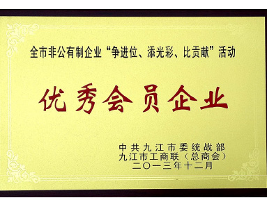 The United Front Work Department of the CPC Jiujiang Municipal Committee and the Jiujiang Federation of Industry and Commerce (General Chamber of Commerce) jointly awarded the honor of "Excellent member Enterprise".