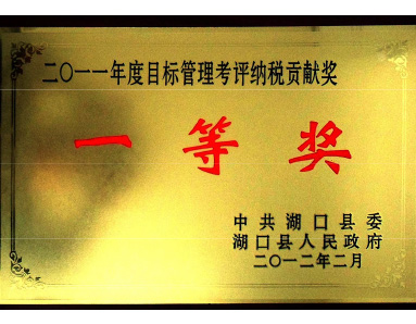 Hukou County Party Committee and Hukou County People's Government jointly awarded the "2011 annual target Management Evaluation tax Contribution Award First Prize" honor.